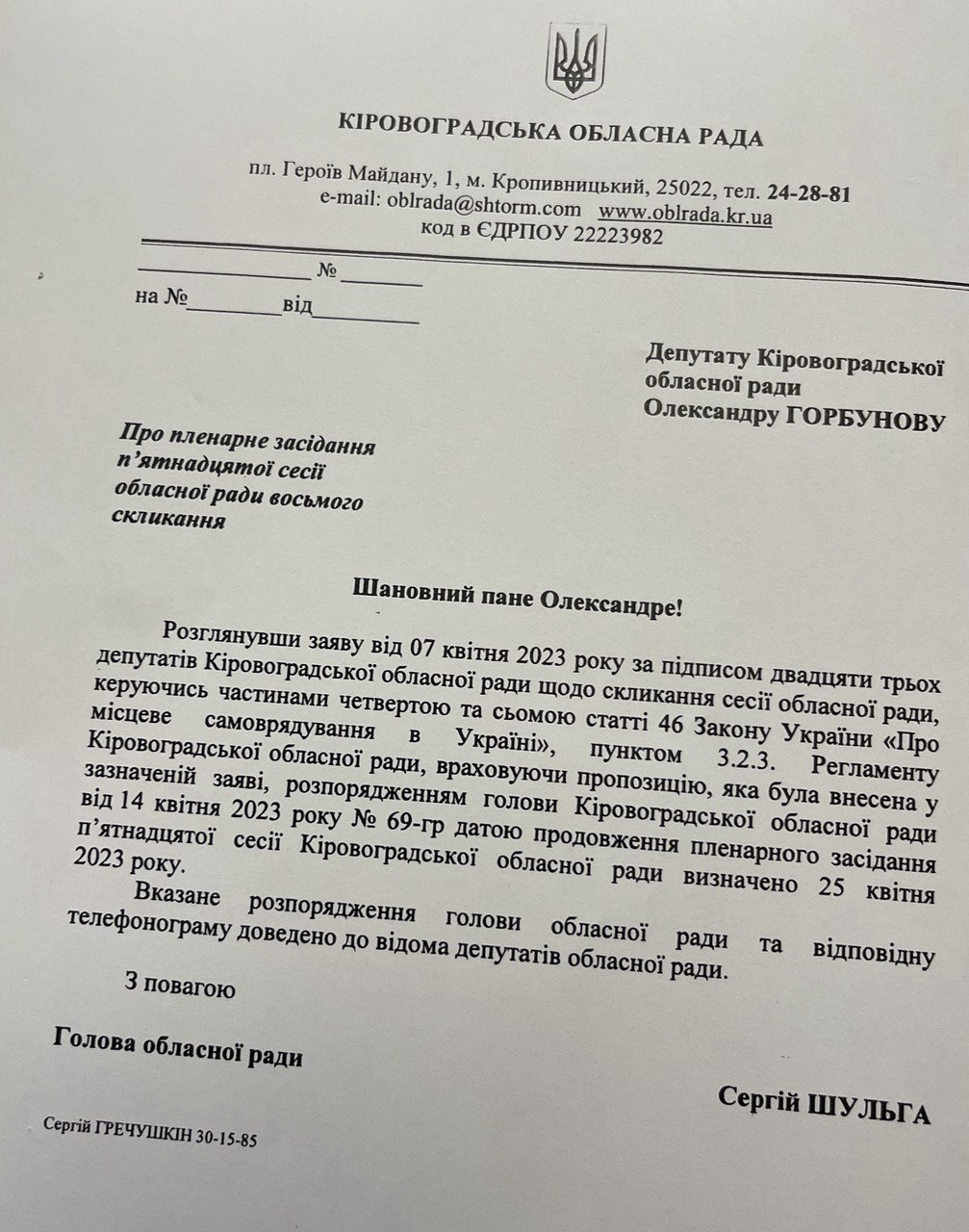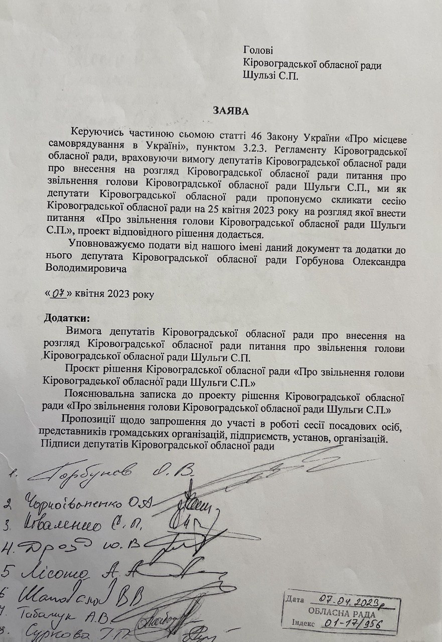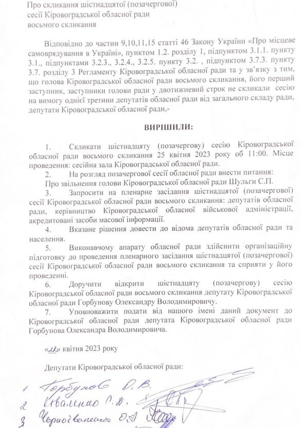 Депутати Кіровоградської обласної ради, які перебувають в опозиції до чинного голови облради Сергія Шульги, вирішили провести сесію без нього. В понеділок до апарату ради надійшла заява за підписом 24 депутатів про скликання 16-ої позачергової сесії, яку доручили провести депутату від фракції “За майбутнє” Олександру Горбунову. Єдине питання, яке вони збираються розглянути у вівторок, — звільнення Сергія Шульги з посади голови облради.