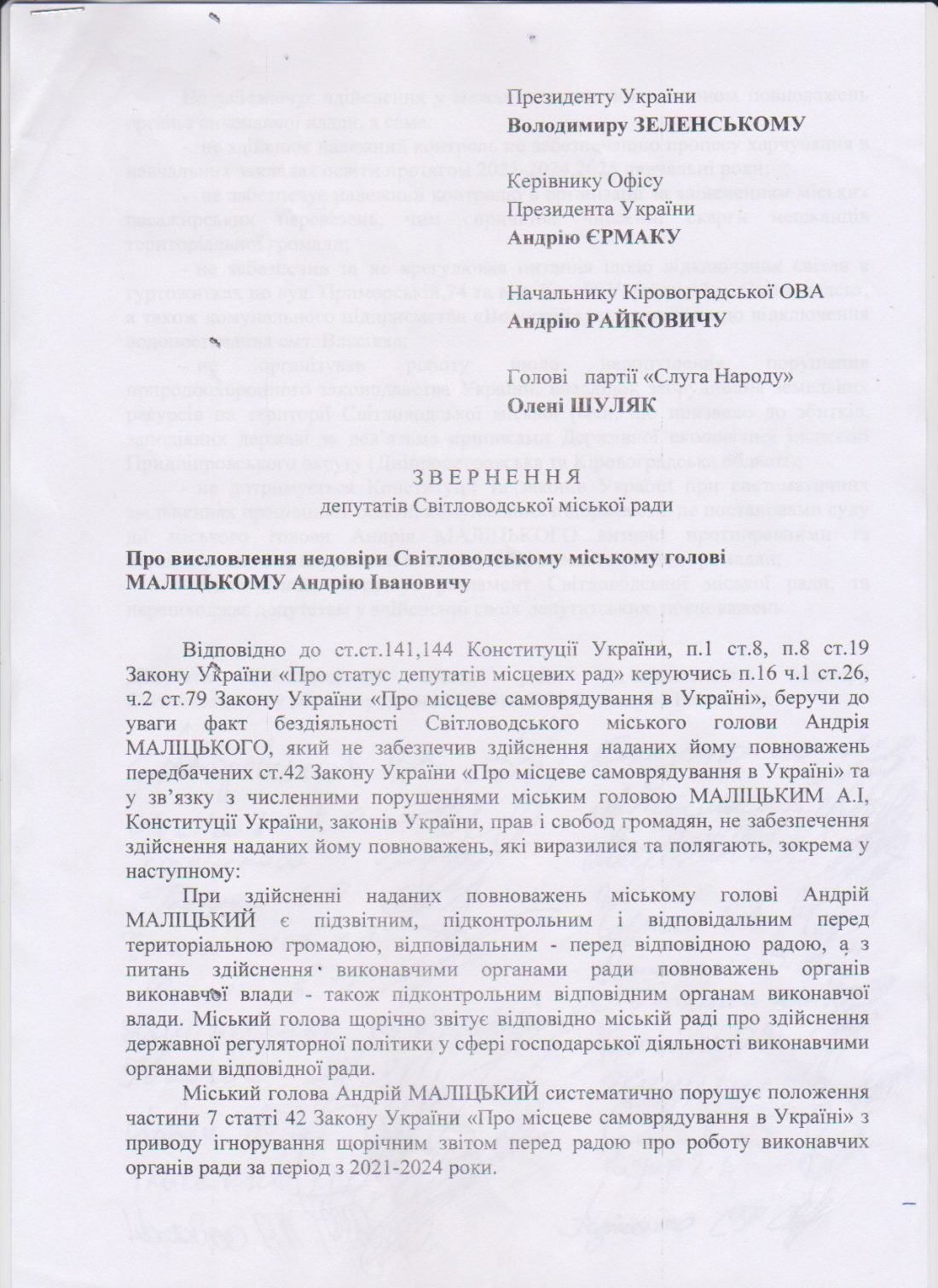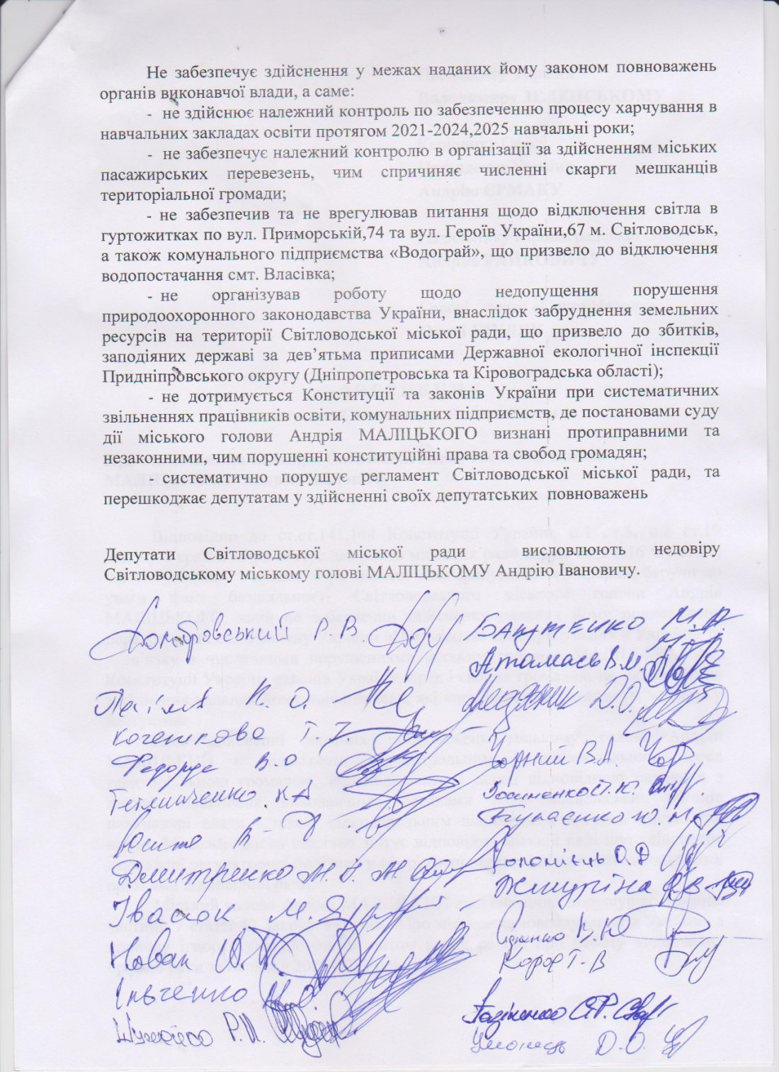 Вчора, 6 травня, депутати Світловодської міської ради висловили недовіру міському голові Андрію Маліцькому і зареєстрували проєкт рішення про дострокове припинення його повноважень.