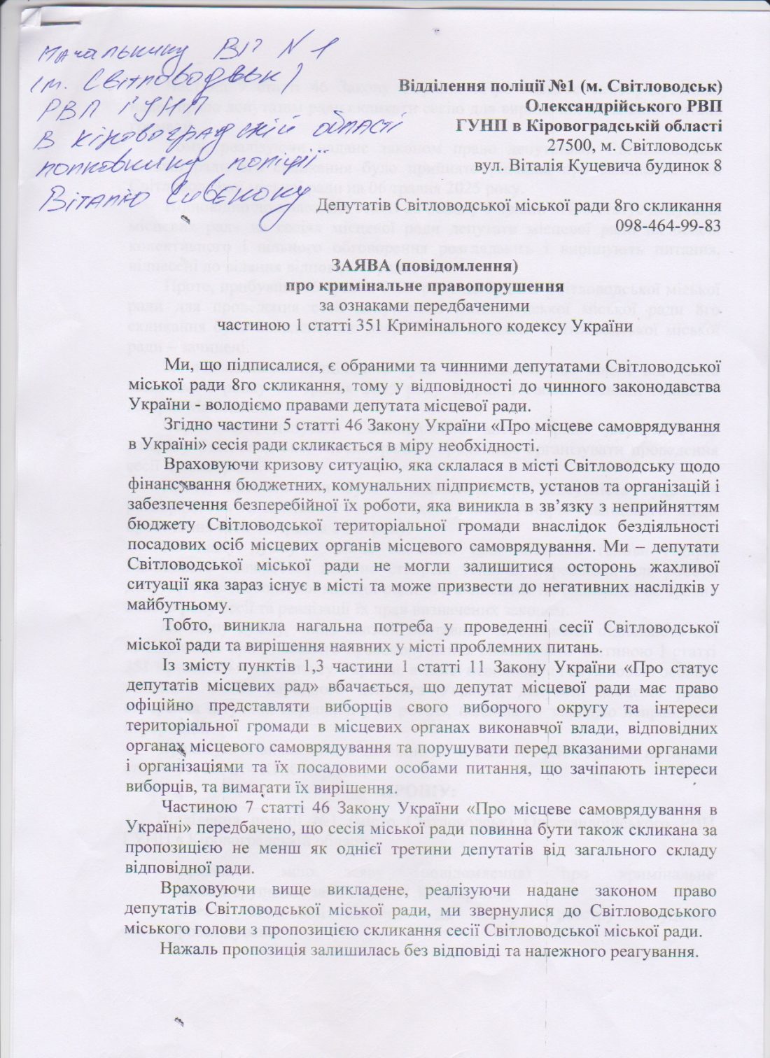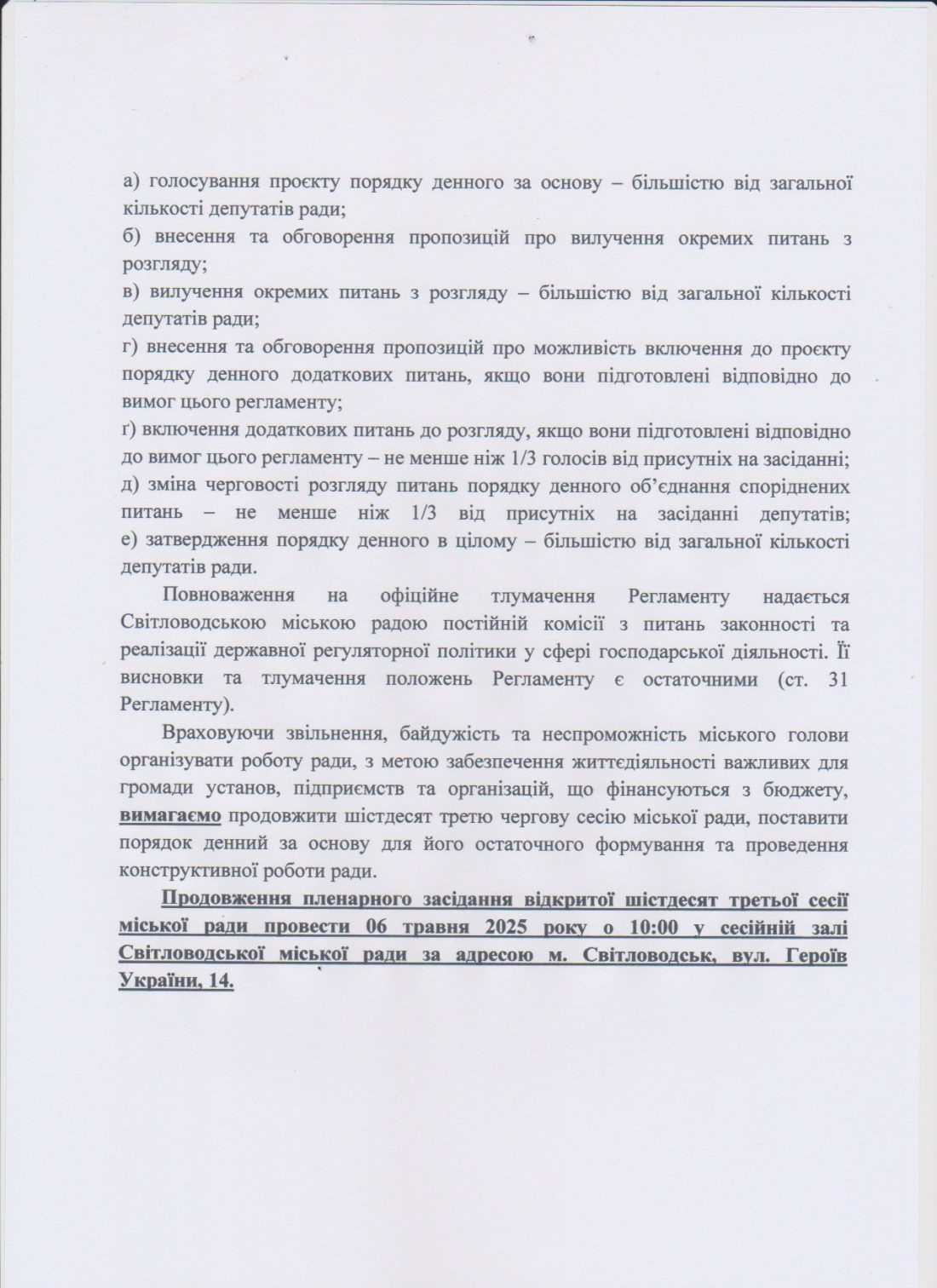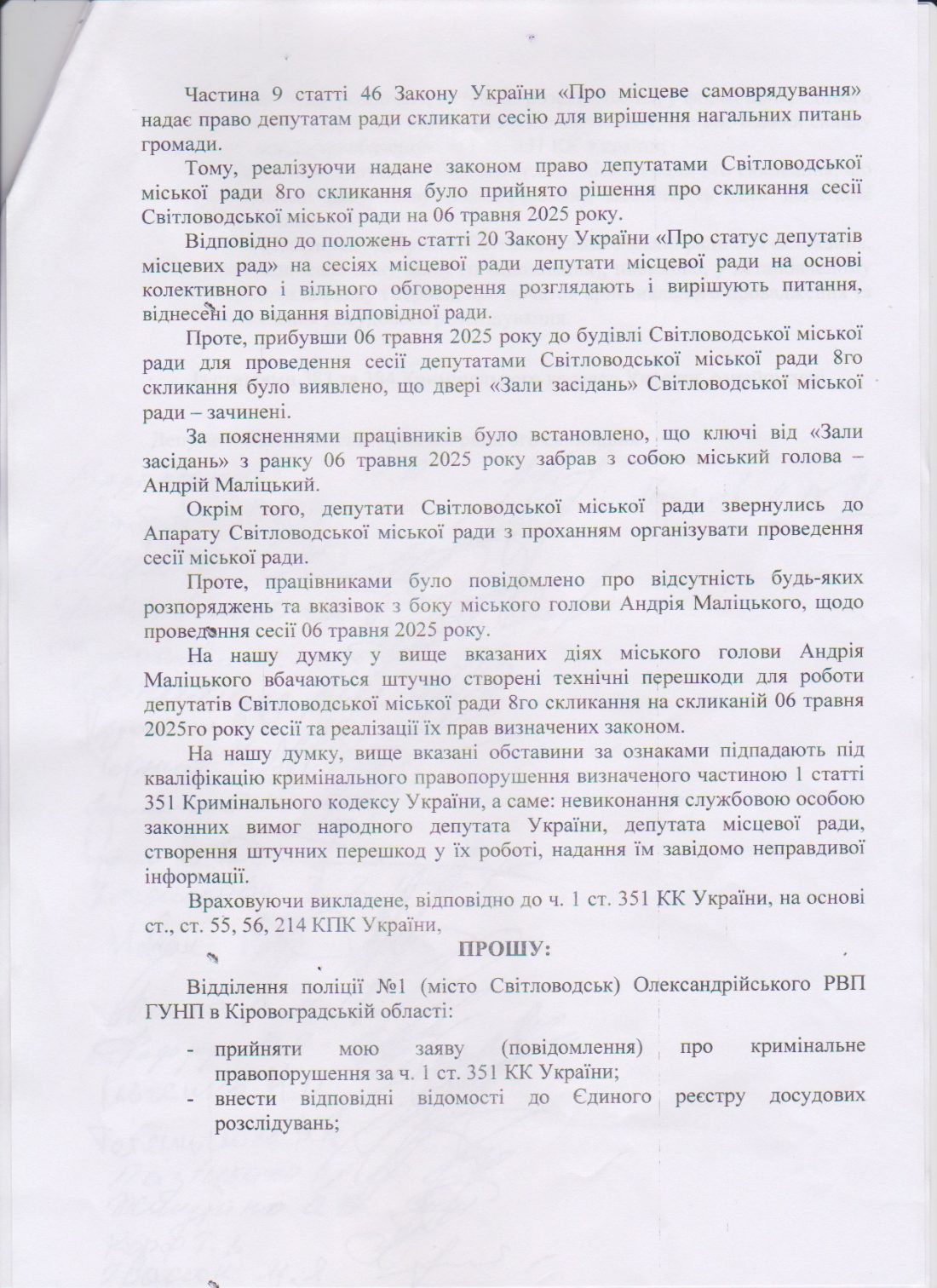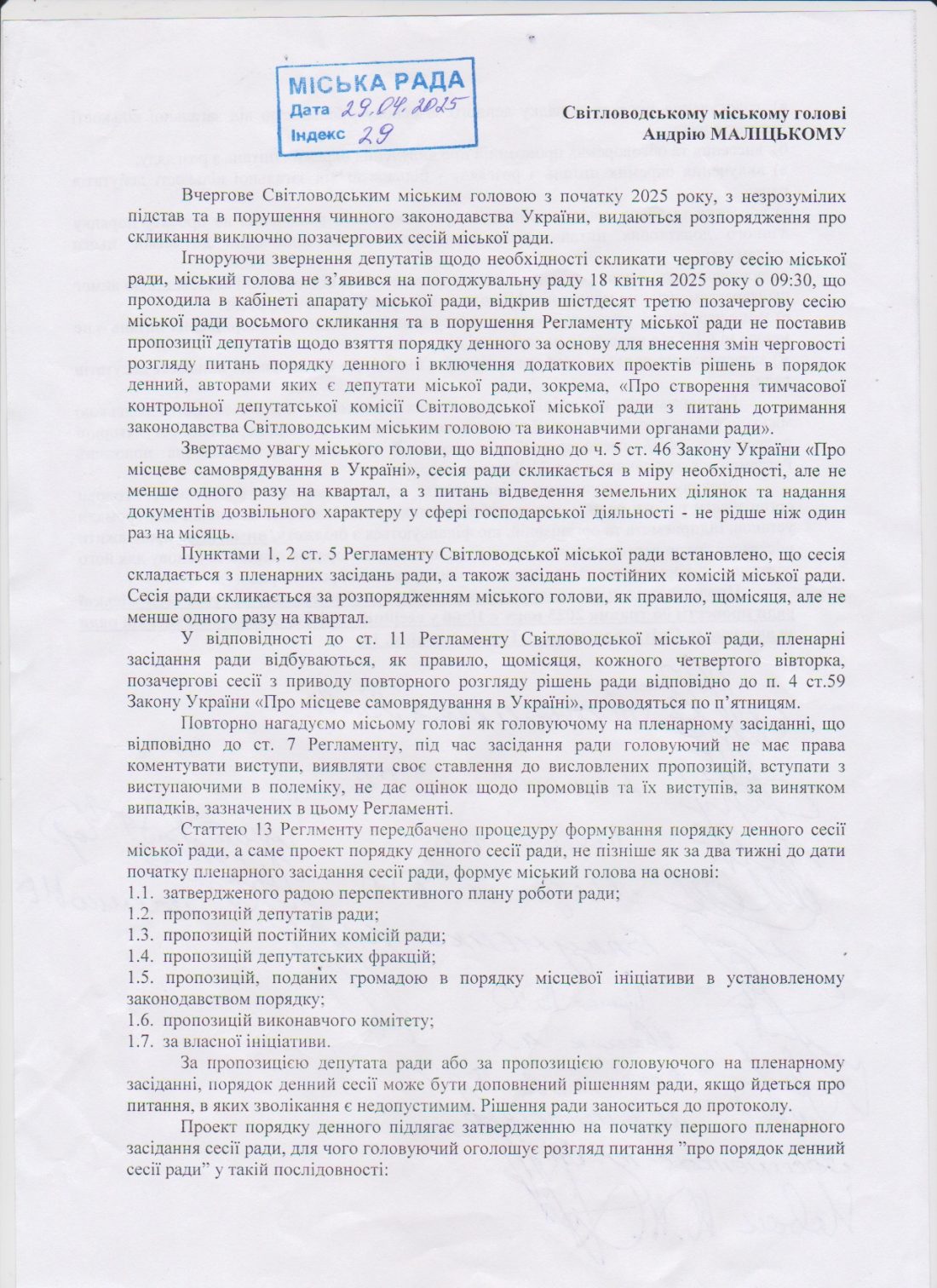 “Сьогодні, перебуваючи з робочою поїздкою на території громади, я отримав інформацію про чергову спробу окремих депутатів провести так звану «сесію» — знову з порушенням закону, без дотримання процедури та зі зривом усіх норм Регламенту. 6 травня 2025 року група депутатів Світловодської міської ради намагалася самовільно продовжити 63-тю сесію, не зважаючи на те, що: згідно з ч. 4 ст. 42 Закону України «Про місцеве самоврядування в Україні» та п. 5.13 Регламенту міської ради, лише міський голова має право визначати дату та місце продовження пленарного засідання”, – написав він учора на своїй сторінці у Фейсбуці. – “Хочу нагадати громаді, що тільки з початку 2025 року, задля прийняття бюджету і термінового розв’язання нагальних питань (допомога ЗСУ, всі державні субвенції, харчування та будівництво житла для ВПО), мною 15 разів скликалися сесії Світловодської міської ради, три з них відбулись, але питання бюджету для окремих депутатів не було пріоритетним”.
