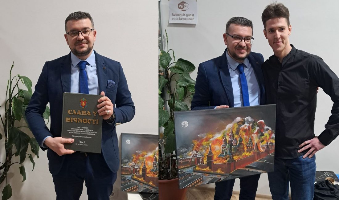 Студент одного із вишів подарував гостю власну картину з зображенням охопленого полум’ям кремля. Олександр Алфьоров сказав, що вона прикрасить його робочий кабінет.