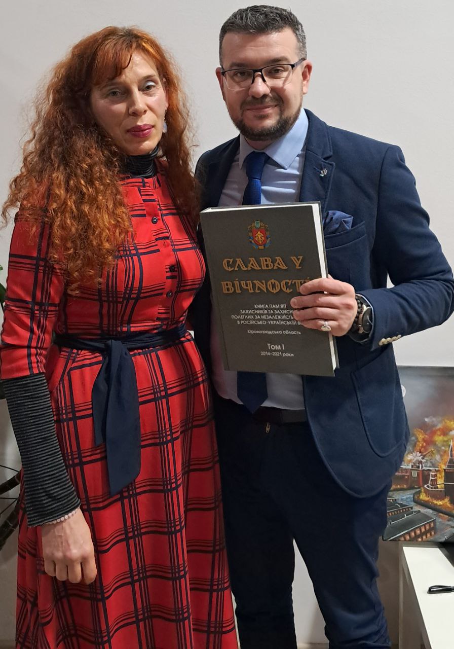 Радниця голови Кіровоградської обласної ради Тетяна Печериця презентувала Олександру Алфьорову перший том науководокументального видання “Слава у вічності. Книга Пам’яті Захисників та Захисниць, полеглих за незалежність України в російсько-українській війні. Кіровоградська область. 2014 – 2021 рр.”