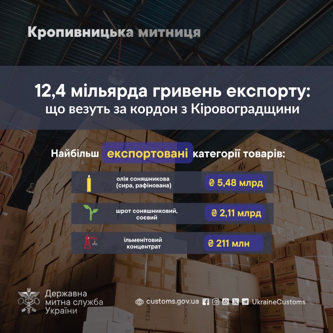 Підприємства Кіровоградської області експортували товарів на 12,4 млрд грн. Про це повідомили у пресслужбі Кропивницької митниці.