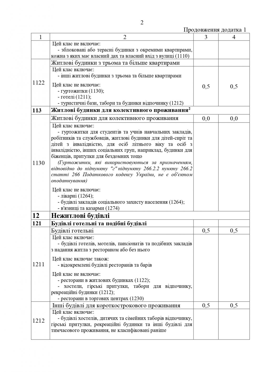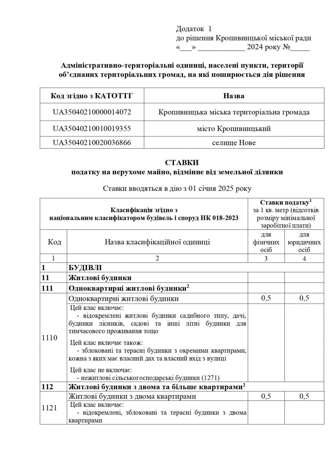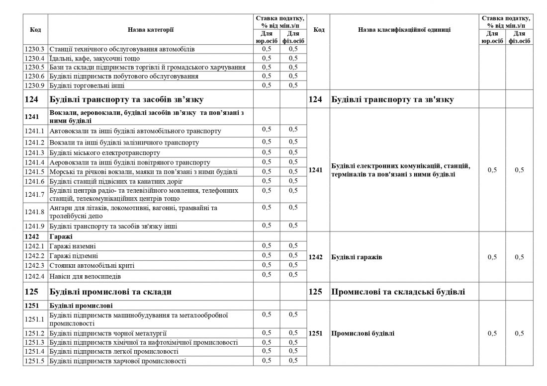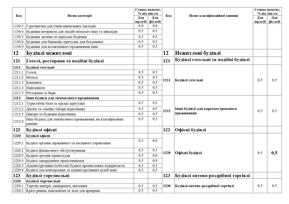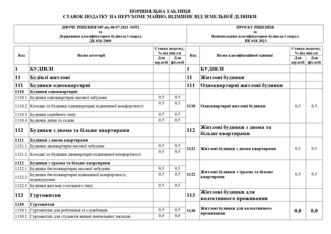 Ставки податку не змінюються по переважній більшості класифікаційних одиниць будівель. Натомість, за рахунок укрупнення окремих категорій будівель та об’єднання їх в класифікаційні одиниці відбувається зменшення ставок податку в окремих позиціях.