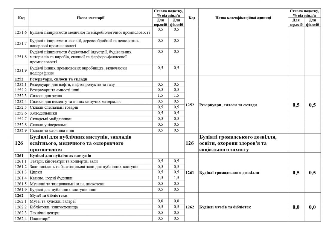 За кодом «Музеї та бібліотеки» по позиціях «Музеї та художні галереї», «Бібліотеки», книгосховища», «Технічні центри», «Будівлі архівів» знизяться ставки для фізичних та юридичних осіб з 0,5% до 0 %.