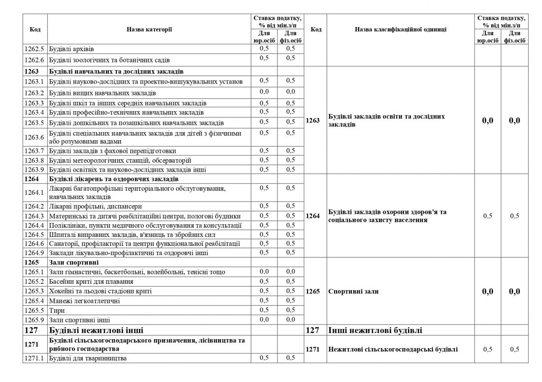 За кодом «Зали спортивні» по позиціях «Басейни криті для плавання», «Манежі легкоатлетичні», «Тири» – знизяться ставки для фізичних та юридичних осіб з 0,5% до 0 %;