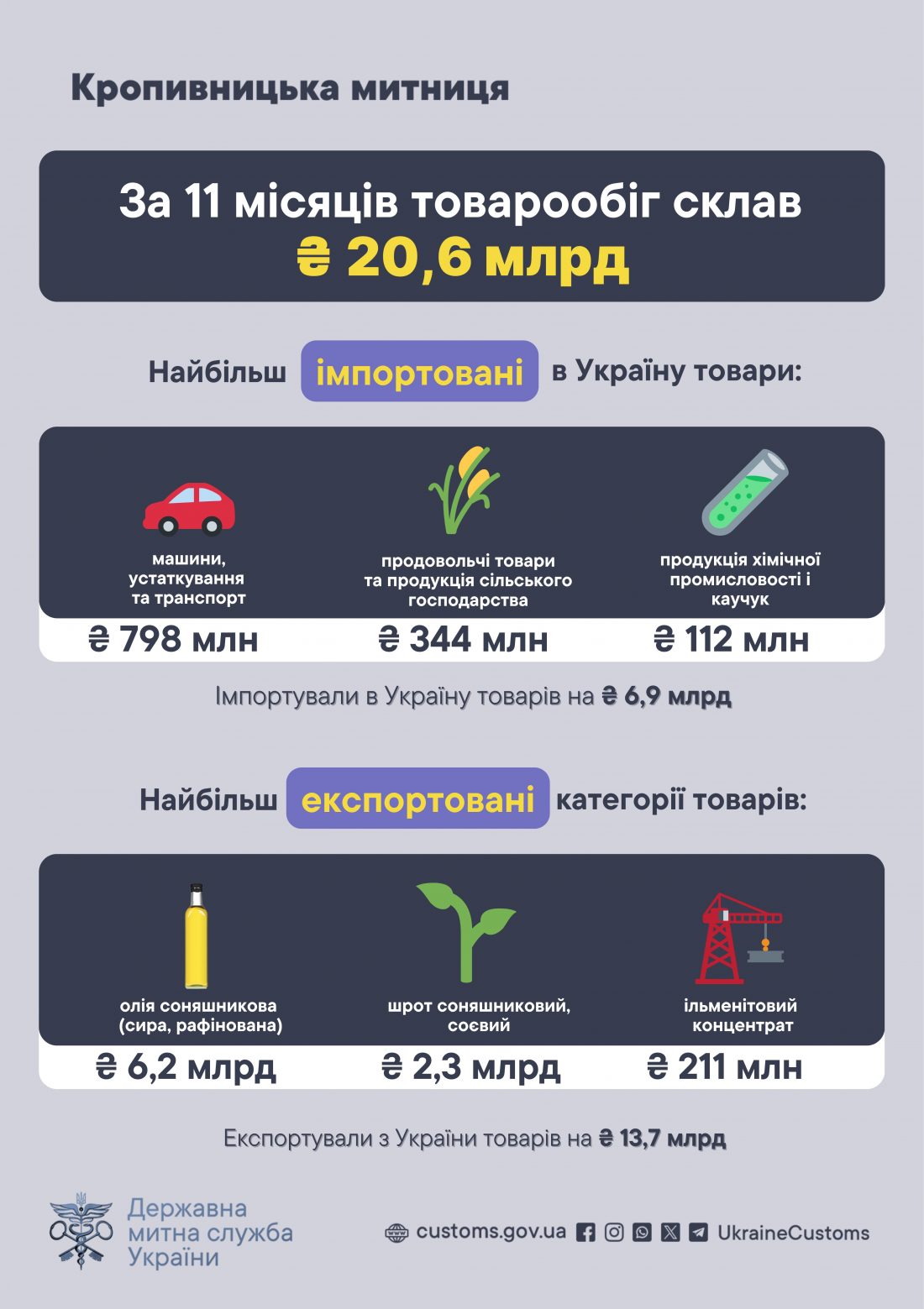 Протягом січня-листопада сума імпортованих товарів в зоні діяльності Кропивницької митниці склала 6,9 млрд грн. Найбільше товарів на 3,7 млрд грн експортували до Польщі.