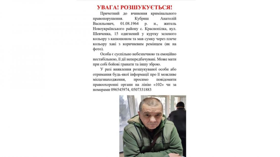 За інформацією правоохоронців, чоловік може бути причетний до кримінального правопорушення. Його характеризують як небезпечного та емоційно нестабільного. Поліція повідомляє, що розшукуваний може мати при собі бойові гранати та іншу зброю.