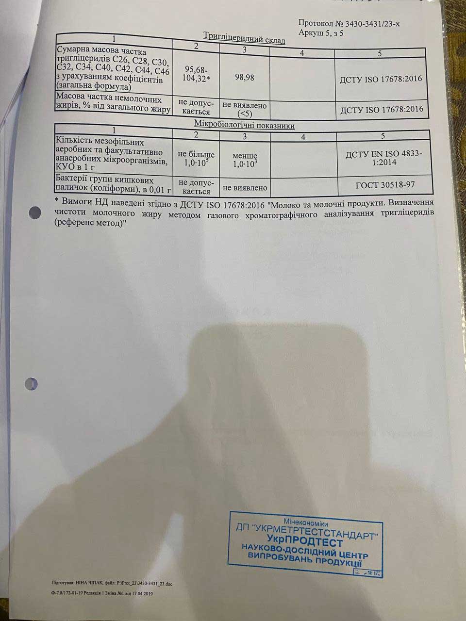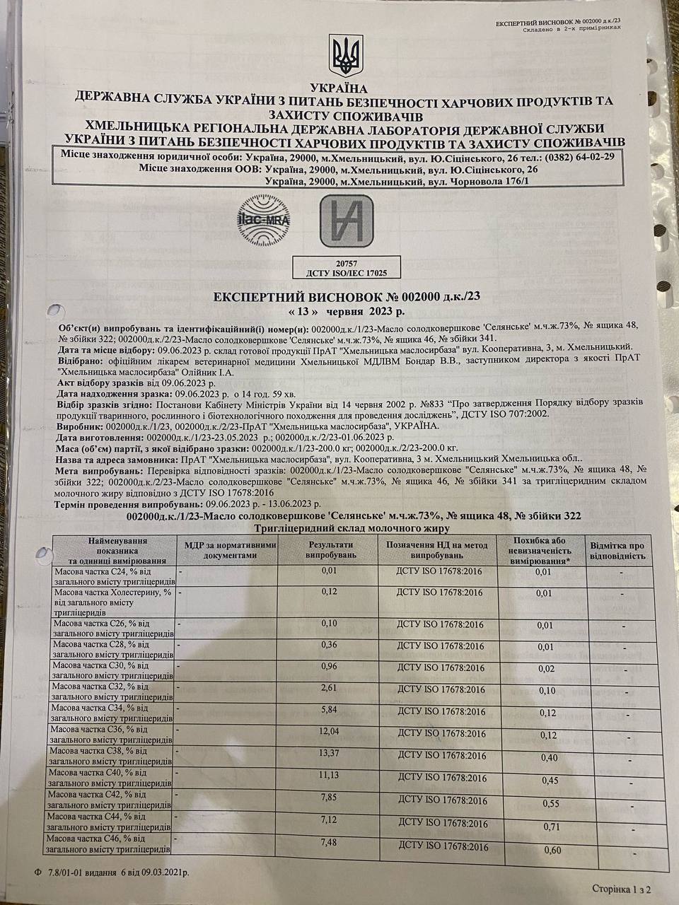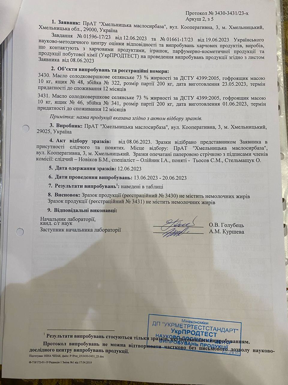 В результаті обох експертиз, проведені на замовлення ХМСБ показали повну відповідність нашої продукції стандартам ДСТУ та відсутність пальмової олії в зазначеній партії товару (результати експертизи додаємо). Слід зазначити, що і Хмельницька маслосирбаза, і Національна поліція досліджували в рамках експертизи одну й ту саму партію товару.