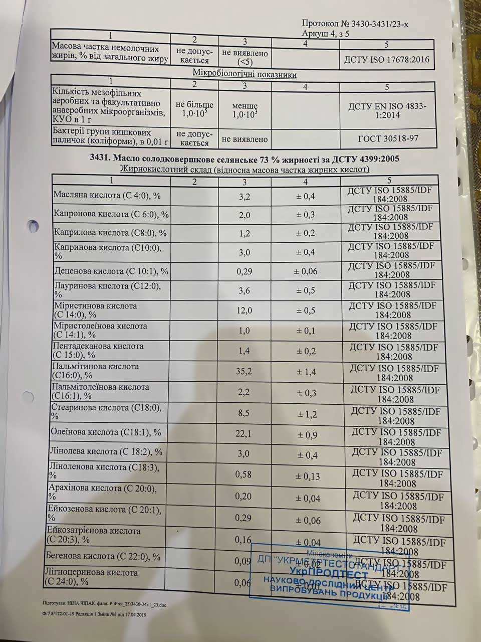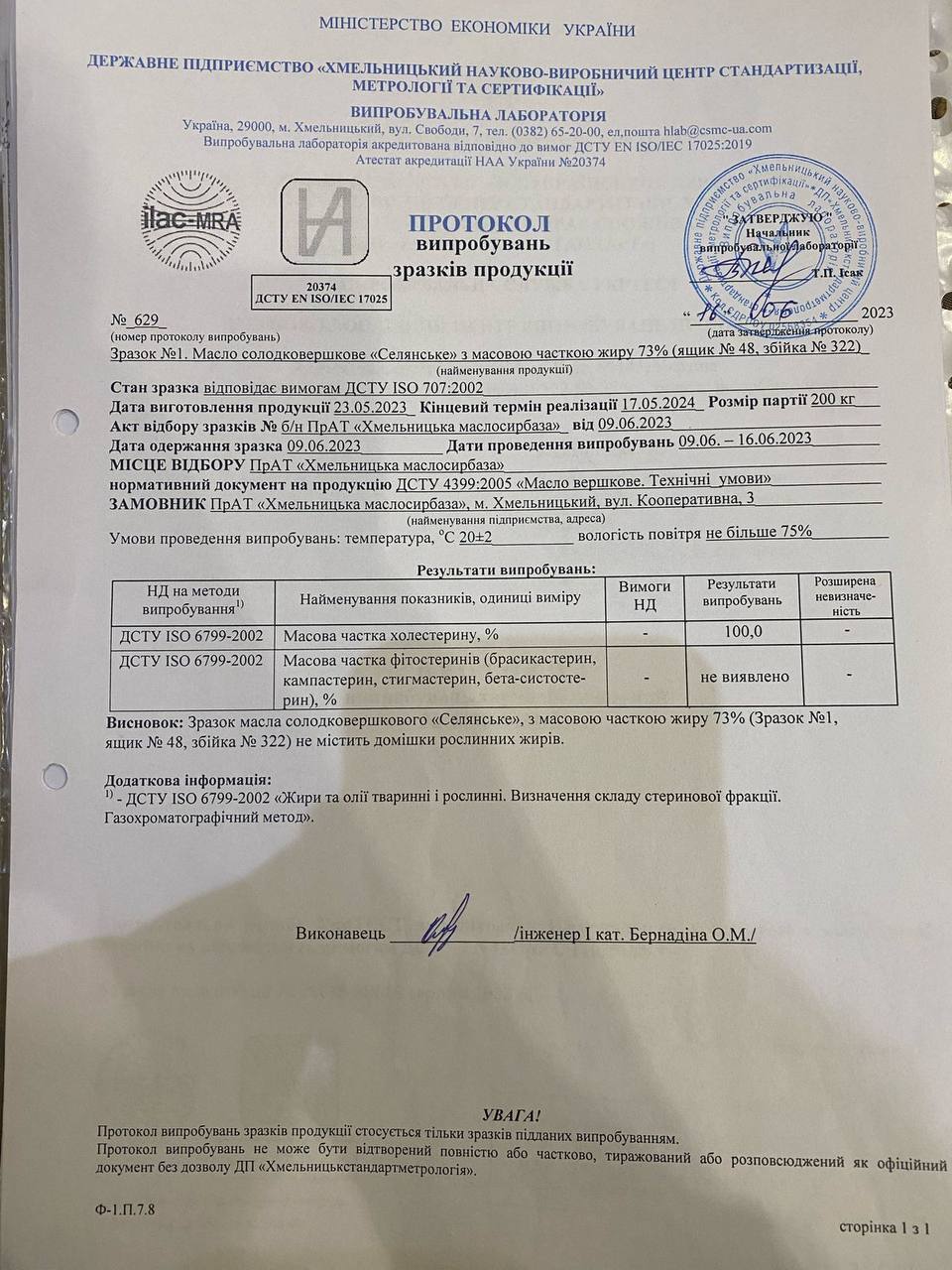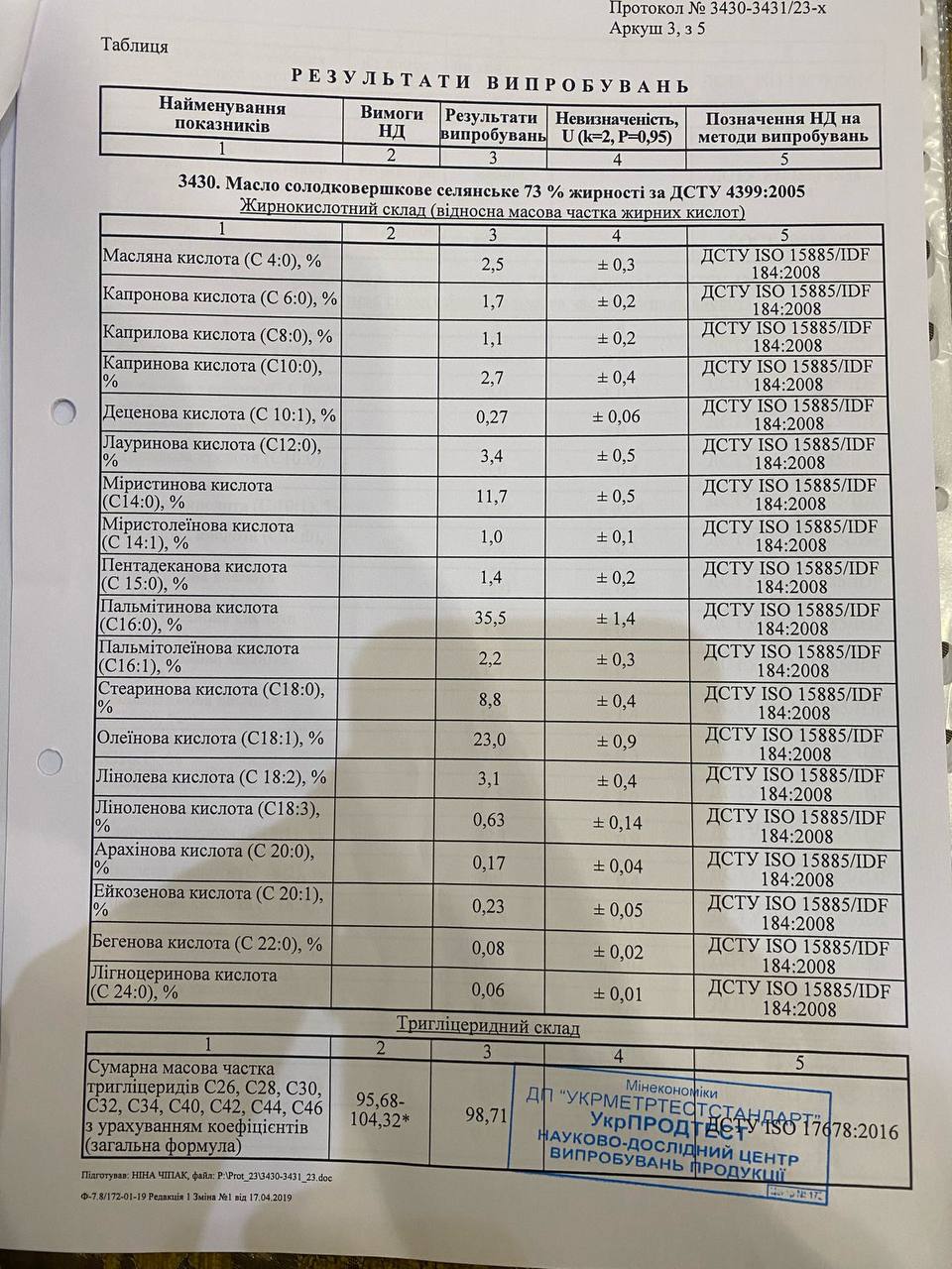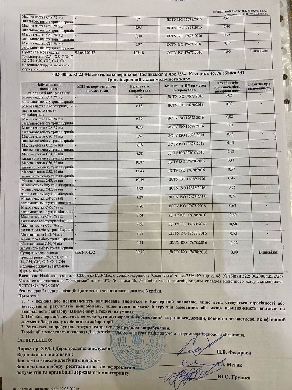 В результаті обох експертиз, проведені на замовлення ХМСБ показали повну відповідність нашої продукції стандартам ДСТУ та відсутність пальмової олії в зазначеній партії товару (результати експертизи додаємо). Слід зазначити, що і Хмельницька маслосирбаза, і Національна поліція досліджували в рамках експертизи одну й ту саму партію товару.
