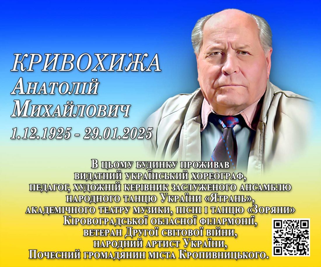 Друга інформаційна дошка вшануватиме народного артиста України, почесного громадянина Кропивницького Анатолія Михайловича Кривохижу. Дозвіл на встановлення отримала Кіровоградська обласна філармонія. Меморіальну дошку розмістять на фасаді будівлі за адресою: вулиця Велика Перспективна, 1-Б. Філармонія також забезпечуватиме її збереження та догляд.