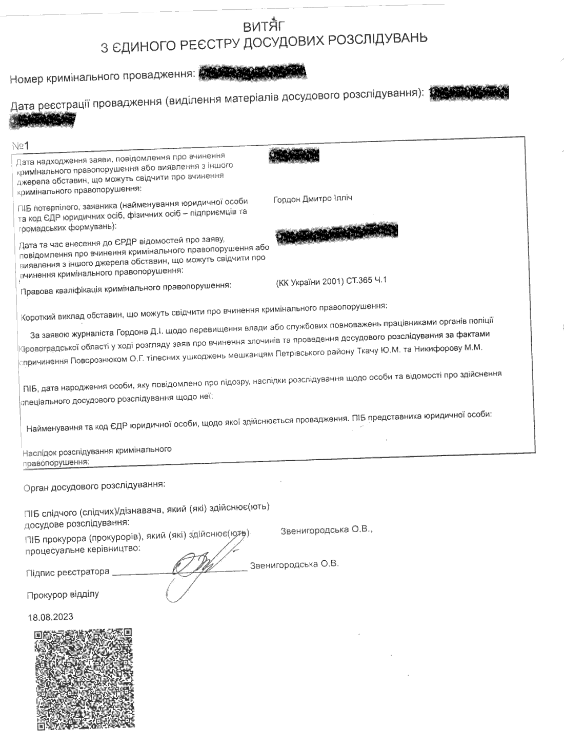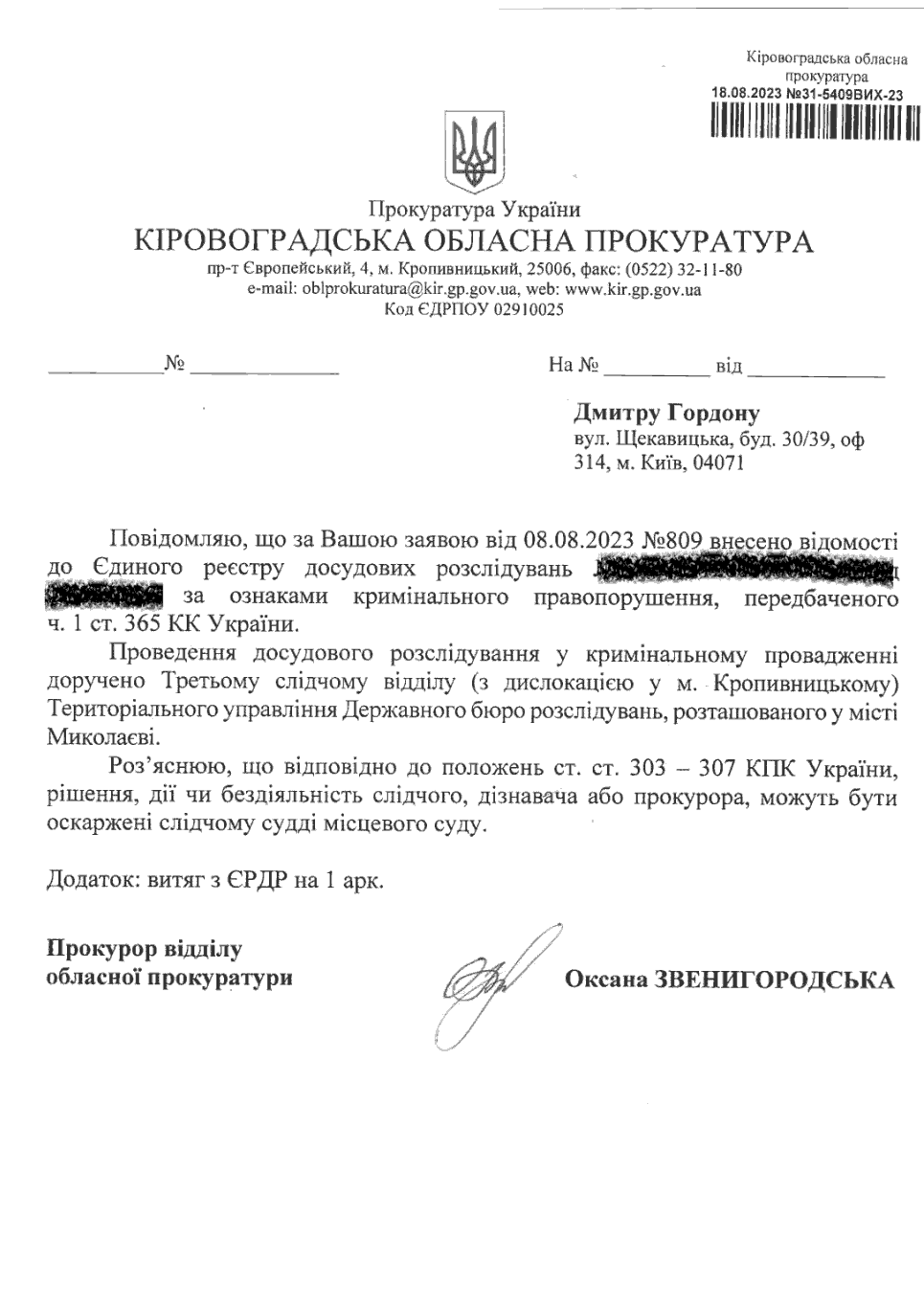 Про це журналісту Дмитру Гордону повідомила Кіровоградська обласна прокуратура у відповіді від 18 серпня 2023 року на його журналістський запит.